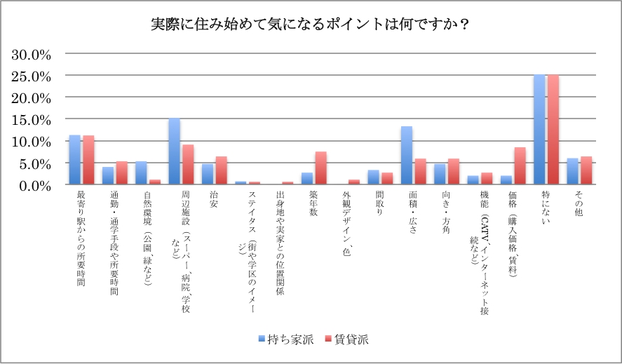 持ち家派は居住後、 「面積・広さ」や「自然環境」といった”住環境”を気にする人が多い。