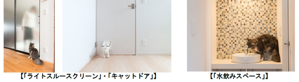 また、 就寝時、 猫が寝室に入れないようロック機能が付いた「キャットドア」を採用したほか、 猫が新鮮な水を飲めるよう、 「水飲みスペース」をリビングに設けました。