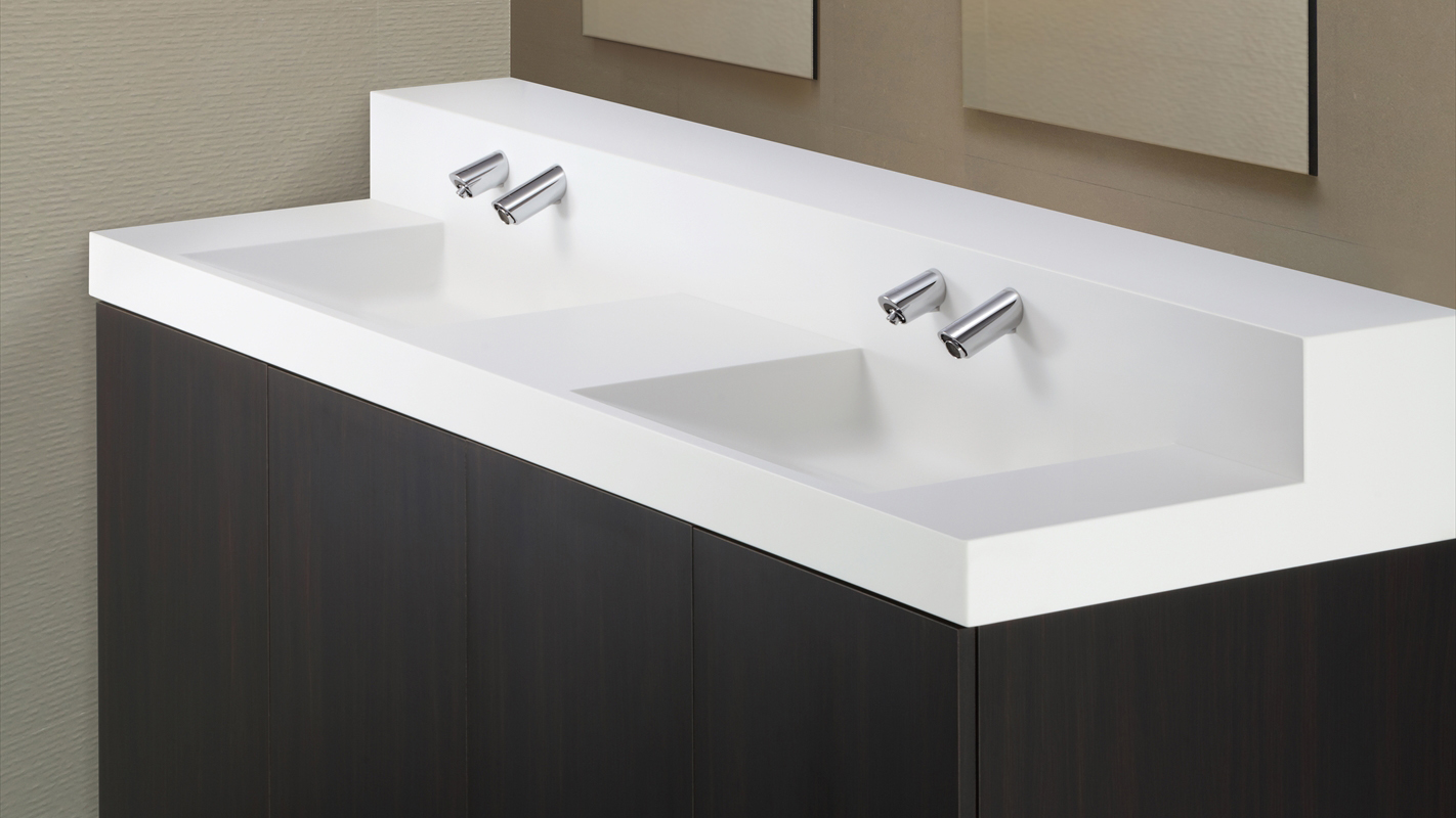 二段形状のカウンターは継ぎ目なく一体成形されており、 なめらかな表面は汚れが溜まりにくいため、 衛生的で日々のメンテナンスも容易です。