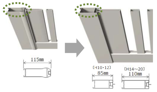 従来2種類あった胴縁サイズを強度性能はそのままにシンプルで軽快な印象の見付サイズの小さい胴縁に統一。