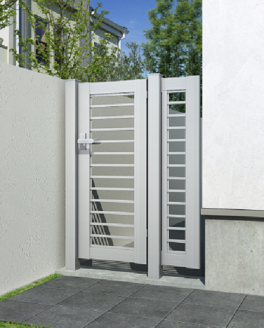 勝手口やサービスヤードの入口など限られたスペースにもピタリと納まる“片開き専用門扉”を設定。