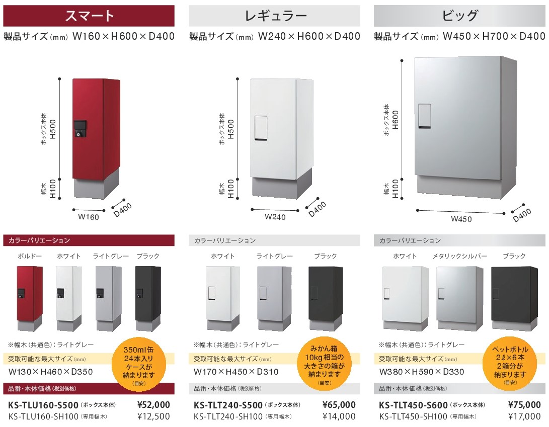 ナスタの戸建宅配ボックスは、 受け取りだけでなく発送サービスに対応し、 6月より日本郵便株式会社がスタートする※「書留配達サービス」にもいち早く対応。 一回での受け取りや多様化するニーズにお応えしております。 これらのサービスに加えて、 住宅の外観になじむデザインを高く評価いただき、 本年度より大手ハウスメーカー各社への標準採用をいただいております。 今回新商品として発売する「据置タイプ」は、 新築はもちろん市場ニーズの高い既設戸建住宅のリフォームにも対応できる仕様となっており、 サイズは3種類(スマート/レギュラー/ビッグ)、 カラーバリエーションも豊富に取り揃え、 設置場所や利用状況によってお選びいただけます。