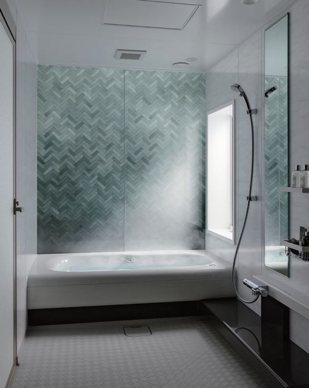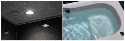 従来に比べ光の拡散を抑えることで演出効果を高めた照明「みなもライト」を搭載。 水面の柔らかな光のゆらぎが天井に映し出され、 また、 風景をモチーフにしたデザインの壁には陰影が生まれる照明設計で、 限られた浴室空間でも表情の変化を愉しめます。