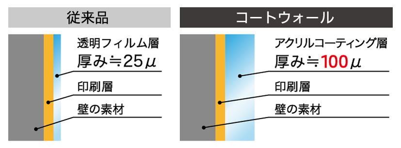 表面のコーティング層が従来品に比べて厚くなめらかなため、 映り込みが美しく高級感があります。 傷つきにくく、 美しさを長く保ちます。