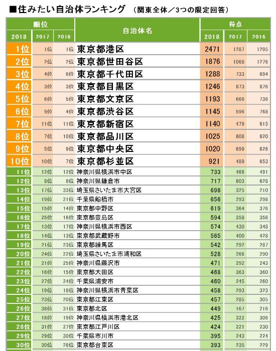 ・1位「東京都港区」2位「世田谷区」が3位以下を離して上位。 3位以下は得点差が少ないがTOP10のすべてが東京23区であった。