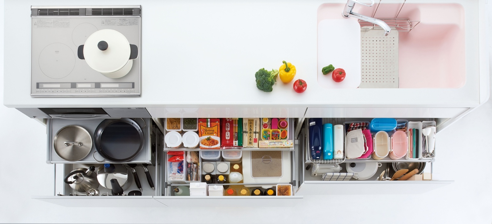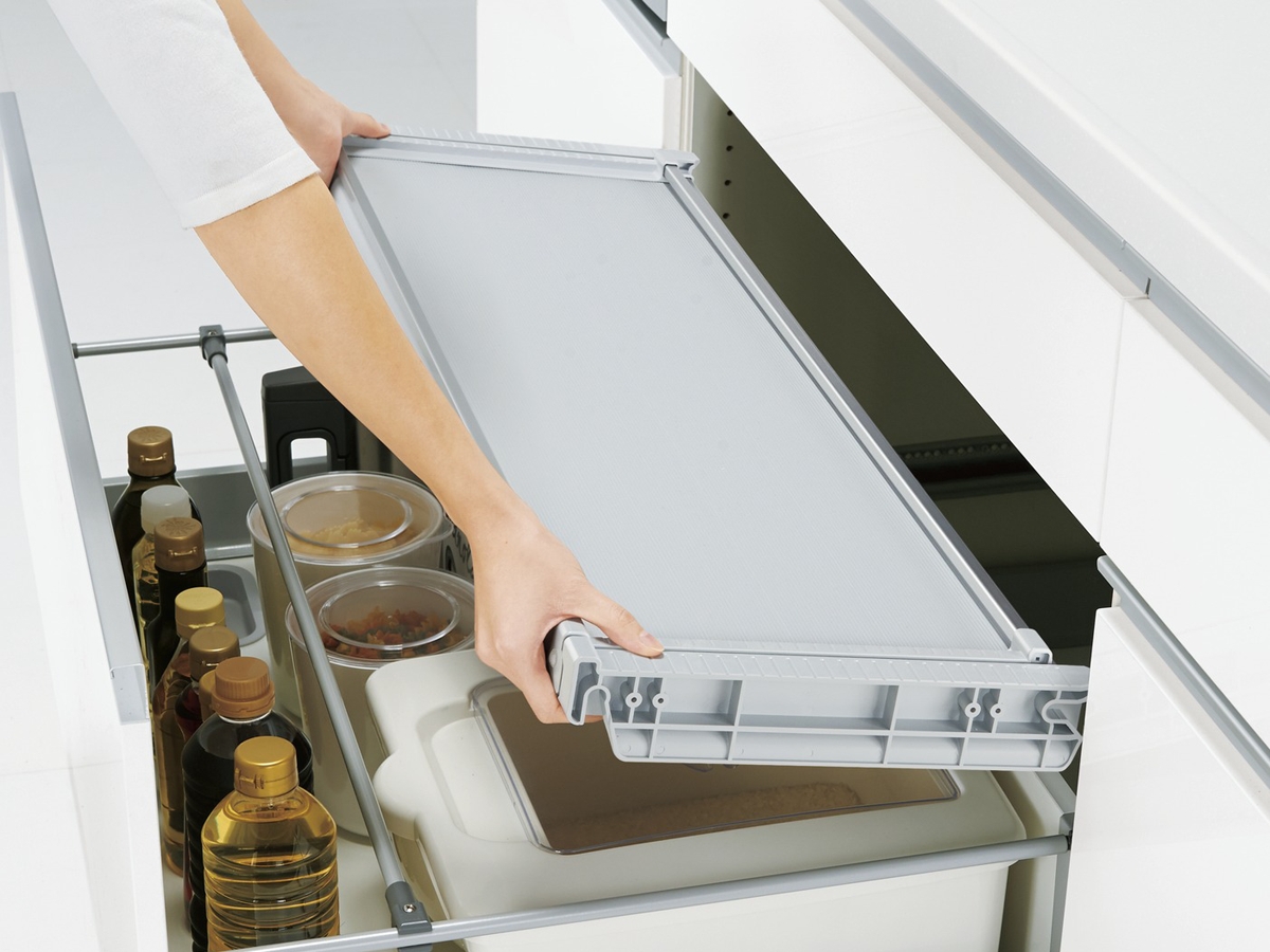 高さを増やした中段引き出しに取り付けられる「どこでもパレット」は、 棚板感覚で工具を使わずに簡単に設置位置を変えられる引き出しのようなアイテムで、 奥をのぞき込んだり、 かがんだりせずに収納物を出し入れできるので、 ライフスタイルの変化に合わせて収納形態を変化できる、 未来を先取りしたハウステック独自の便利な収納です。