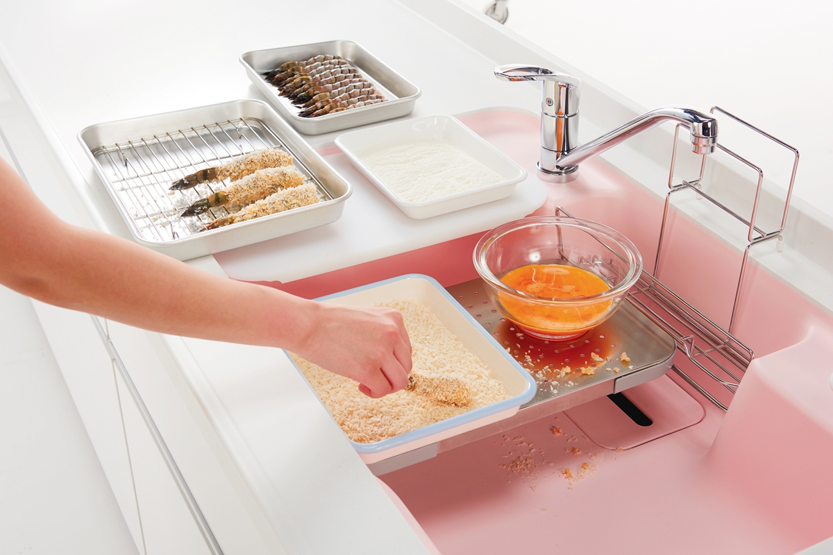 また、 シンクの上下で使用できる2枚の作業プレート類を標準装備、 周辺が汚れやすい作業や、 腰に負担がある作業などを、 快適にこなせるようにしました。