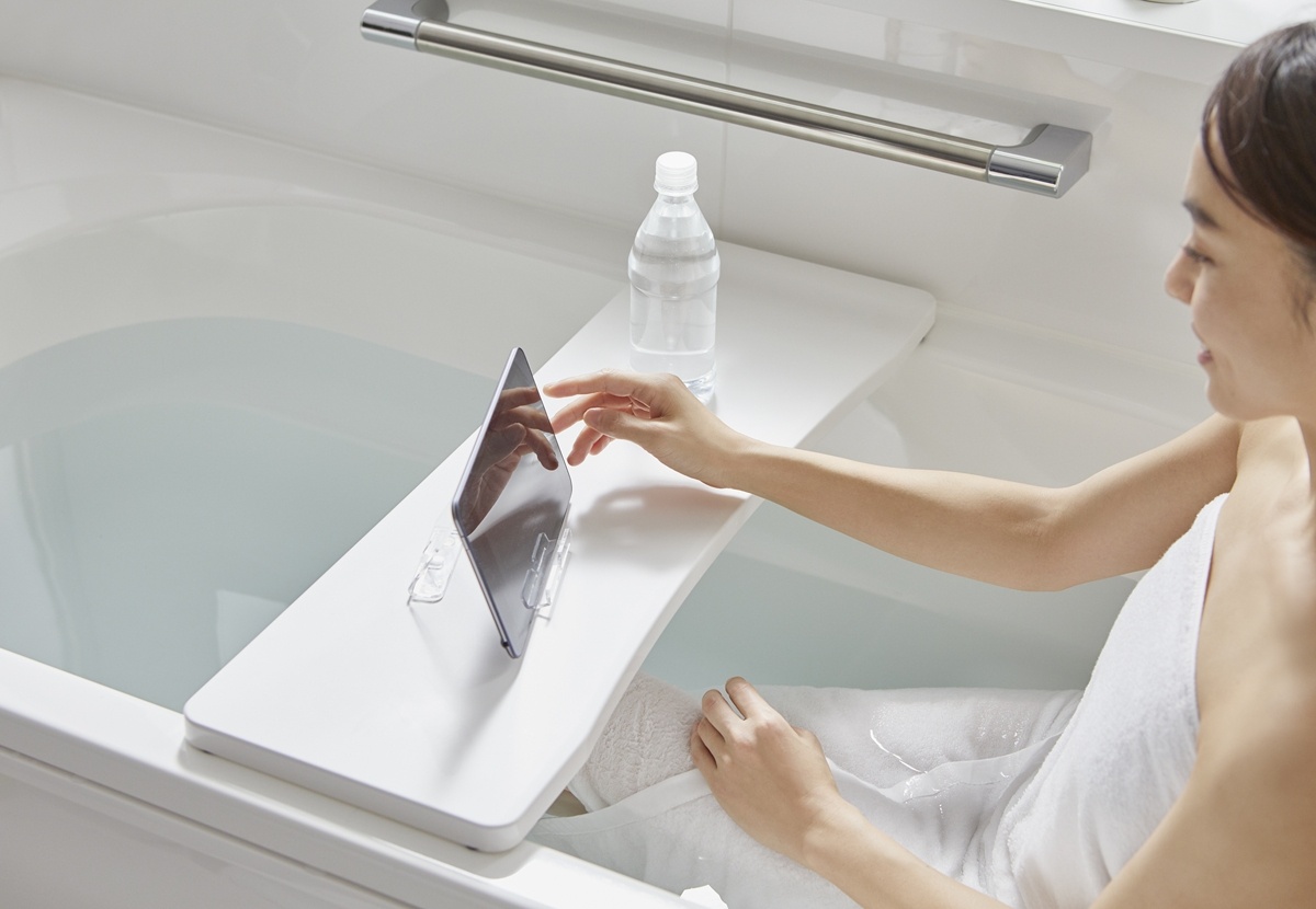 簡単に取り外しができるため、 カウンターの表も裏も気になる壁面も、 すべてを簡単にお掃除できます。 しかも、 その重さは約1kg。 女性でも片手で簡単に持つことができます。 さらに、 取り外したカウンターは浴槽の上に置いてテーブル代わりにも使うことができ、 1台2役の技ありのカウンターです。