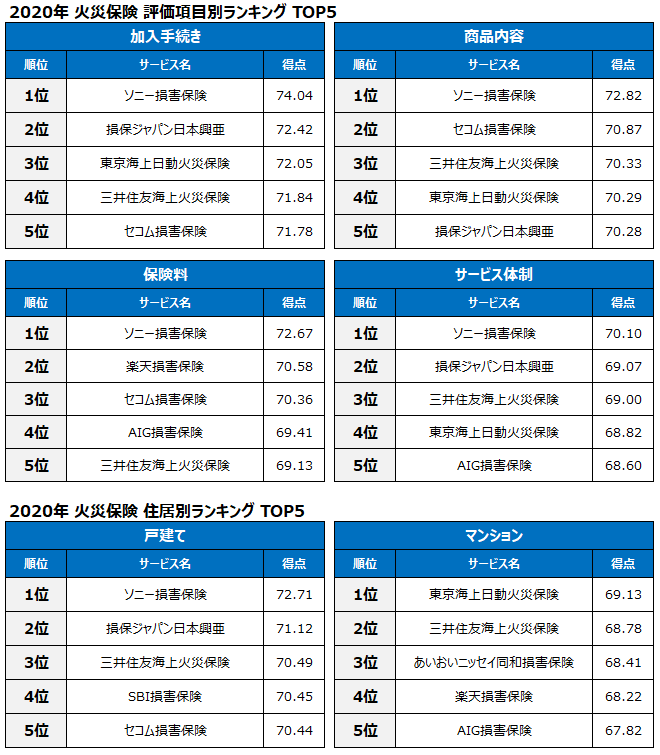 評価項目別でも、 4つすべての項目で【ソニー損害保険】が1位に。 また、 住居別の「戸建て」でも【ソニー損害保険】が1位を獲得しています。 住居別の「マンション」は【東京海上日動火災(本社:東京都千代田区】が1位となりました。 また、 2位以下については、 各項目で評価が分かれる結果となりました。