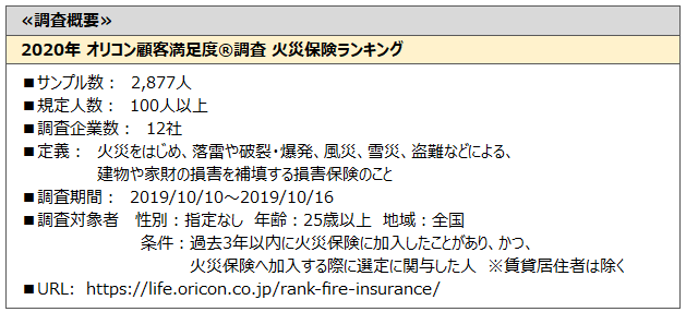 “見えない満足を可視化する”をコンセプトに、 第三者の立場で独自に企画し調査を実施する「オリコン顧客満足度(R)」( https://life.oricon.co.jp/ )を展開する株式会社oricon ME(本社:東京都港区、 代表取締役社長:小池恒)は、 『火災保険』についての調査を実施し、 本日その結果を当社サイト内にて発表いたしました。
