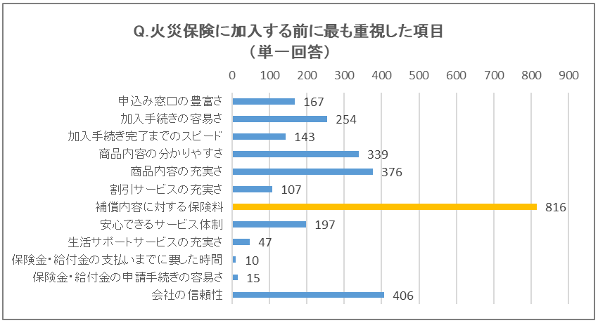 火災保険に加入する前に最も重視した項目について、 「補償内容に対する保険料」が全体の約30%となる、 816人が回答した結果となりました。 続いて、 回答者が多かったのは、 「会社の信頼性」「商品内容の充実さ」「商品内容の分かりやすさ」となり、 いずれも300人前後の回答数となっています。