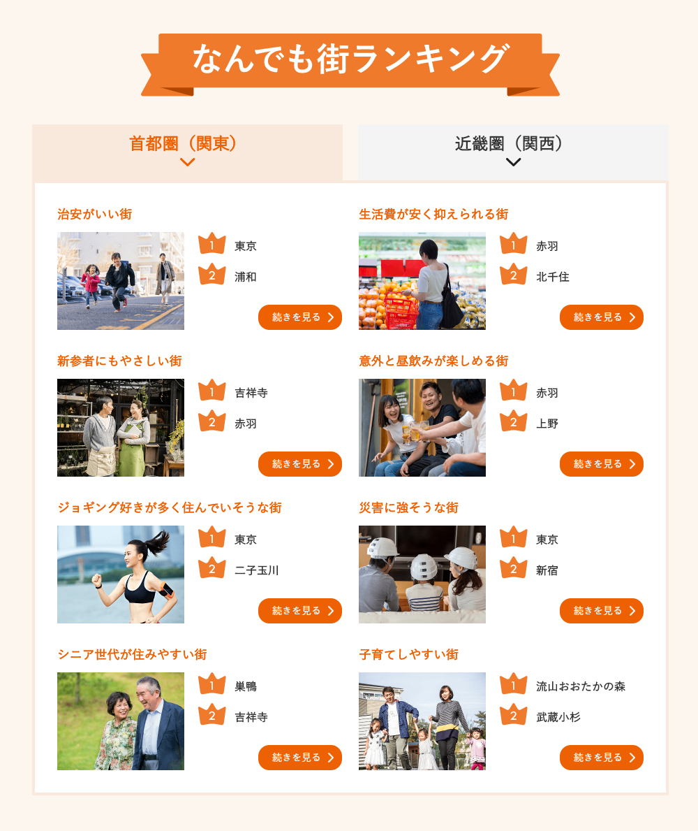 「なんでも街ランキング」は、 さまざまなテーマに対し、 思い浮かぶ街を答えてもらいランキング化したものです。 回答は単なるイメージではなく実際に知っている(足を運んだことのある)街の中から思い浮かぶ街を答えてもらったもので、 首都圏、 近畿圏それぞれのエリアごとに、 上位10位まで結果をご紹介しています。