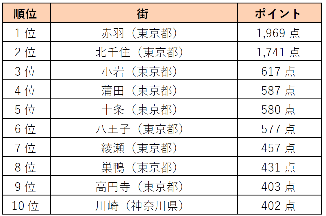 北千住、 小岩、 蒲田、 十条、 巣鴨などについては駅前に大きな商店街があって飲食店や日用品の物販店が多いことから、 生活コストが抑えられるイメージに直結していると考えられます。