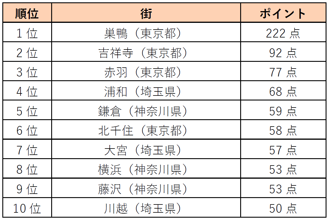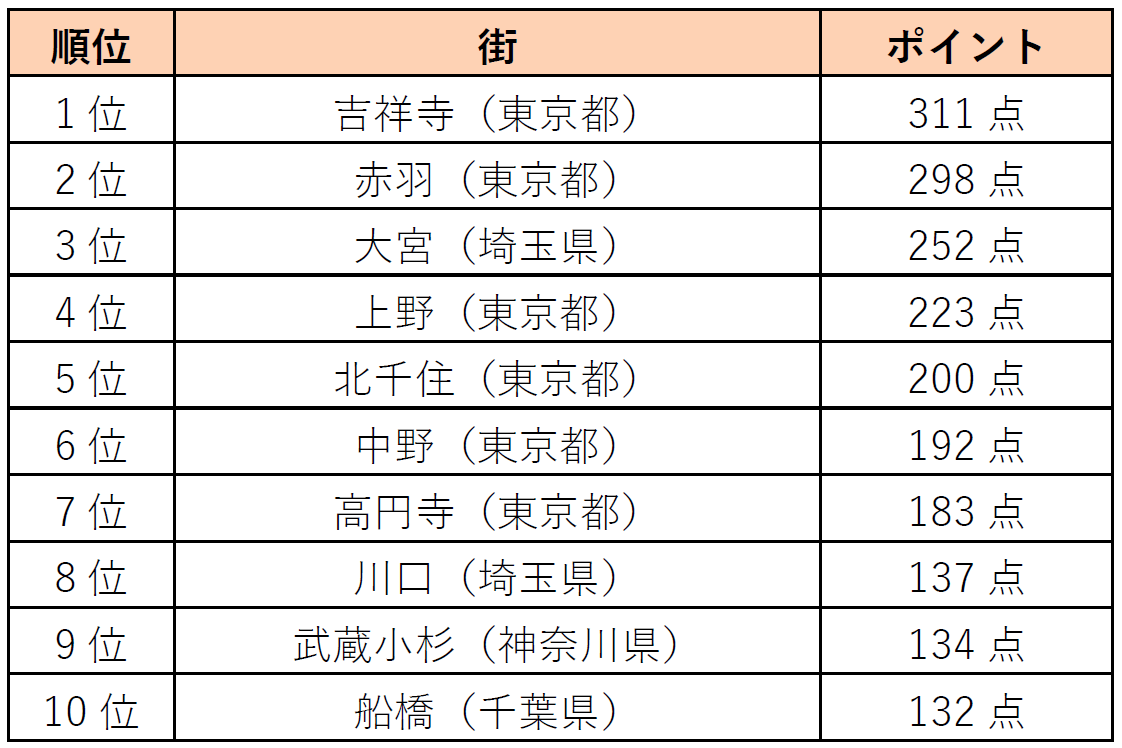 「新参者にやさしい街」は、 1位「吉祥寺」(東京都)、 2位「赤羽」(東京都)、 3位「大宮」(埼玉県)と拠点性のある街がランクインしました。