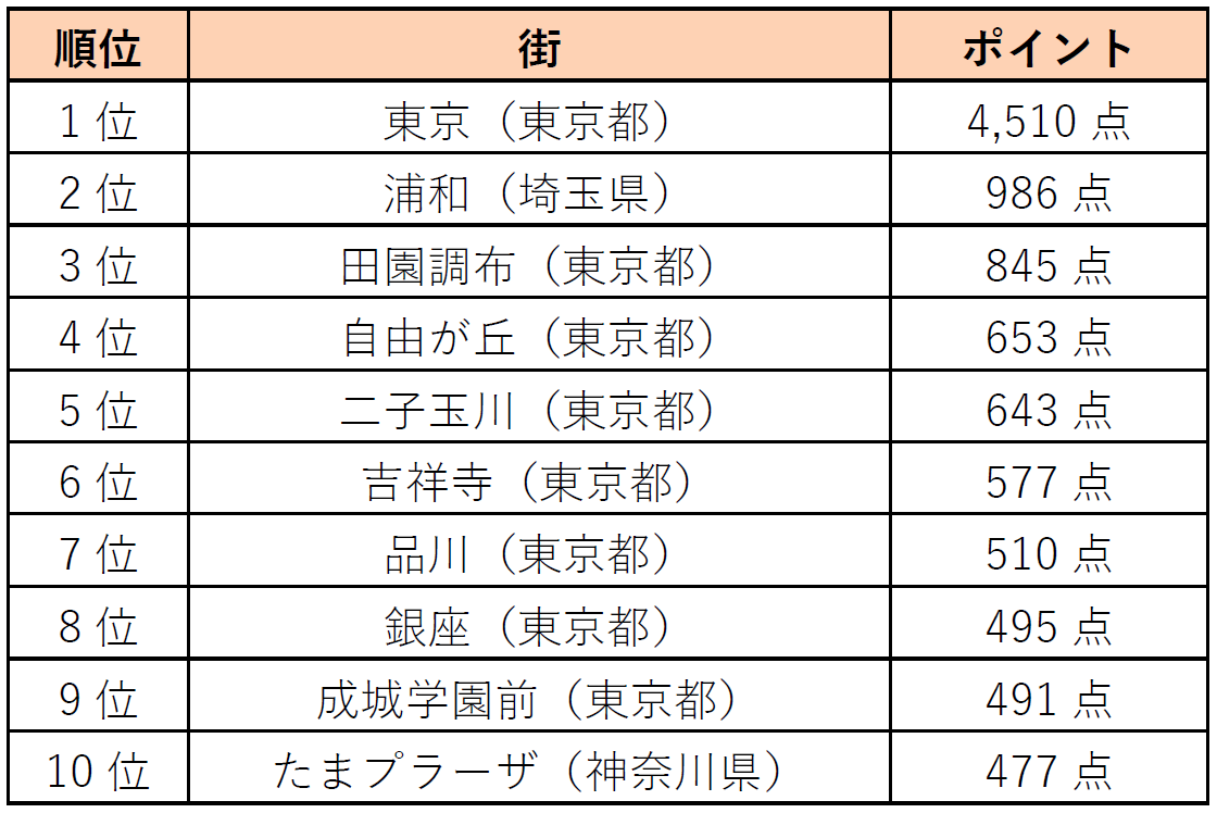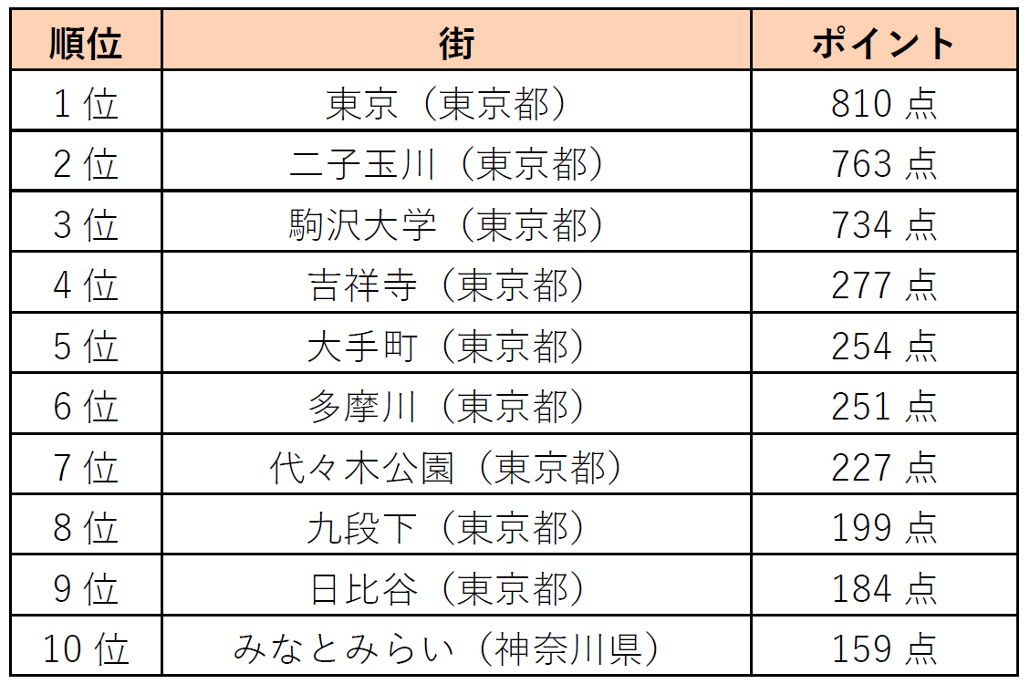「治安がいい街」は、 1位「東京」(東京都)、 2位「浦和」(埼玉県)、 3位「田園調布」(東京都)となりました。 一人暮らしや子育て世代は、 交通や生活面で暮らしやすいかどうかに加えて安全性を重要視するケースも多く、 「治安」は物件選びの際に重要なポイントです。