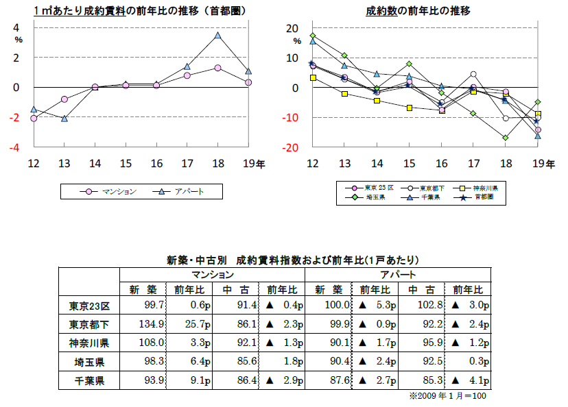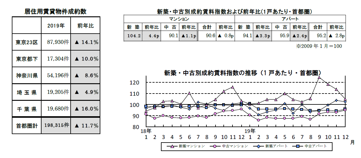 なお、 1戸あたりの成約賃料指数(首都圏平均)は、 新築マンションのみ前年比上昇し100を超えました。 また、 新築マンションの月別指数の推移は、 2019 年1年間の全ての月で100を超えています。