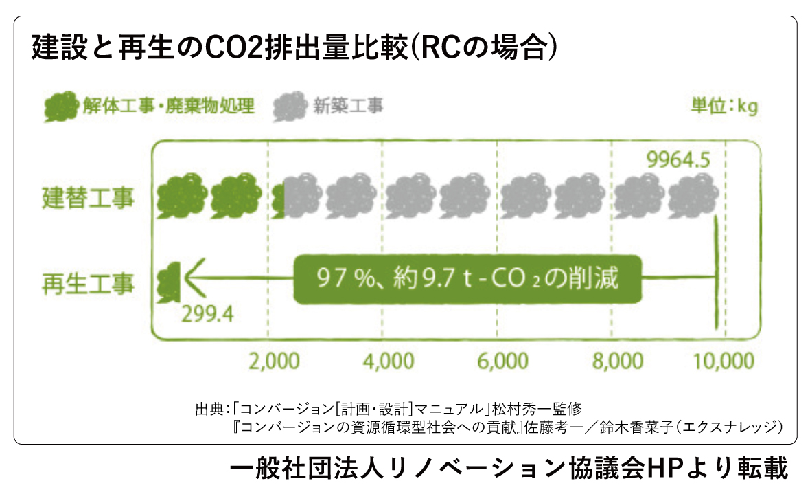 一方で、 「廃棄物や環境負荷を減らせる」は約1割に留まる結果に。 一般社団法人「リノベーション協議会」によると、 マンションなどの構造体であるRC構造の場合、 CO2排出量は建替工事に比べて33分の1とわずかで、 廃棄物の発生も22分の1で済み、 資源の節約に直結しています。 (右図参照)