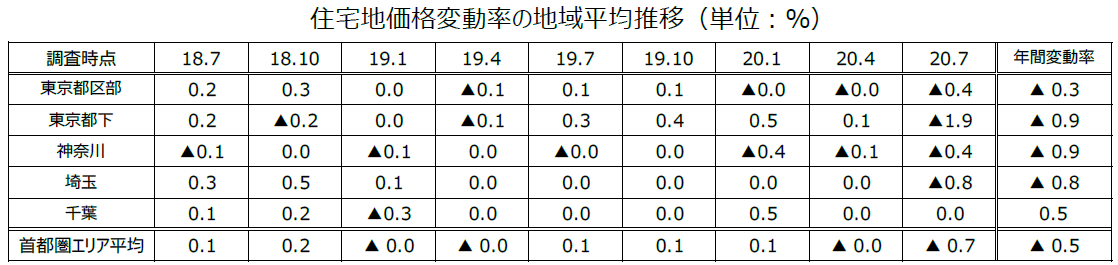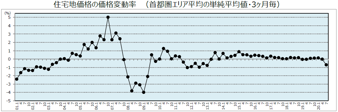 2020年4-6月期の「住宅地価格」は、首都圏エリア平均では▲0.7%(前回▲0.0%)の変動率となりました。