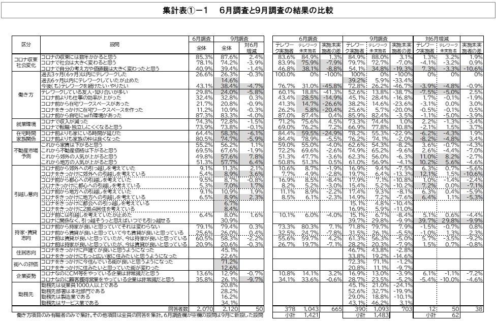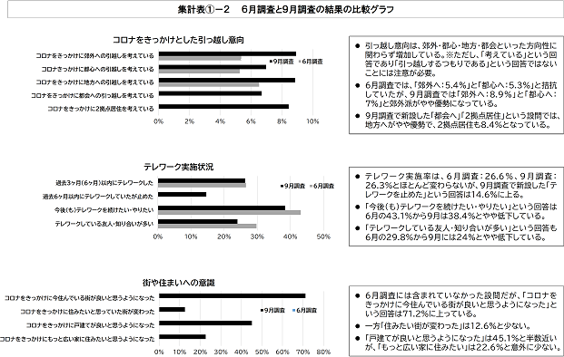 テレワーク実施者が大きく減少し郊外・地方への引っ越し意向がやや優勢に