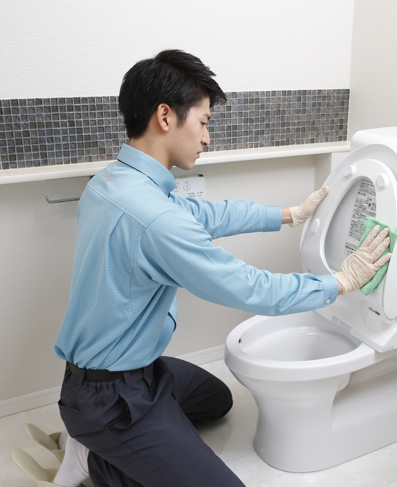 サービスマスタースタッフ1名がトイレクリーニングと新品便座の取付・取替を実施