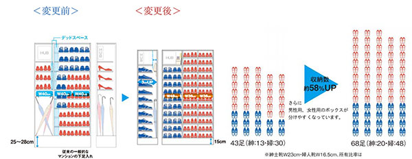 収納数が約58%アップした下足箱(弊社従来仕様比)。 底板がすべて取り外し可能でますます便利に。