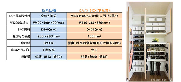 (2)(120cm幅の下足箱の場合)48cm幅のボックスを確保することで、 40cm幅では難しかった男性用の靴を2足並べることが可能に。