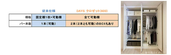 新商品は従来の<ジオフィット プラス デイズ>の収納をさらに改良または開発し、 <DAYS BOX>、 <DAYS クロゼット>、 <DAYS ウォークインクロゼット>としてデビューいたします。 また、 「DAYS(デイズ)」シリーズとして、 弊社新築分譲マンション「ジオ西宮北口 クラウンズ」(兵庫県西宮市大屋町/2016年2月竣工予定/総戸数20戸)にて初採用いたします。