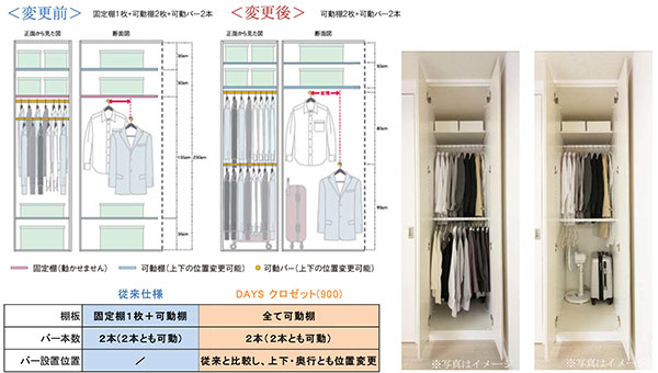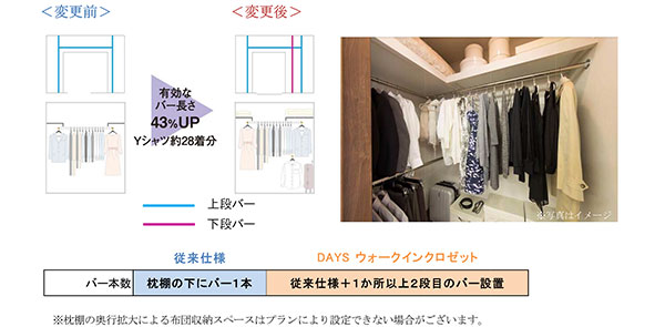 ⇒コートやワンピース等の長いものよりも、 数の多いシャツ、 ジャケット等をかける収納量が1アップしました。