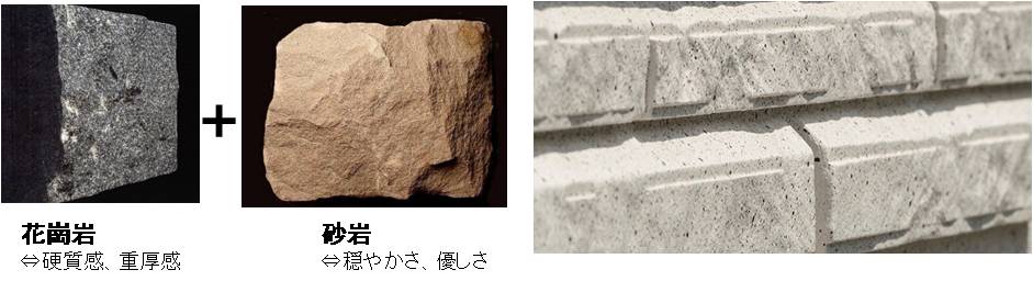 硬質で強さを感じさせる花崗岩と、 優しく穏やかな印象を与える砂岩を掛け合わせた新しい表情を与えています。
