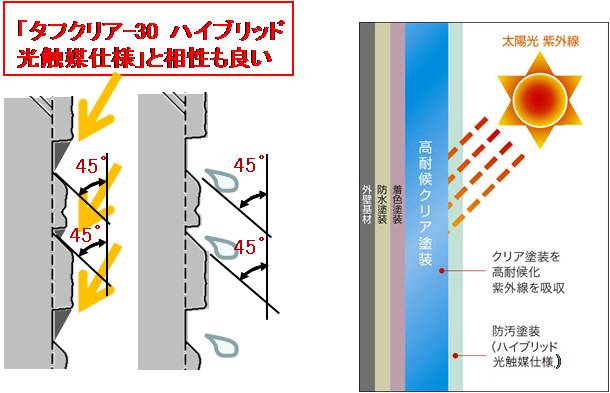 45°の傾斜部は、 この様に汚れを洗い流すという機能も持っています。 高耐久外壁「タフクリア-30 ハイブリッド光触媒仕様」と相まって、 汚れの分解と超親水による防汚性を発揮し、 美しさをいつまでも保ちます。