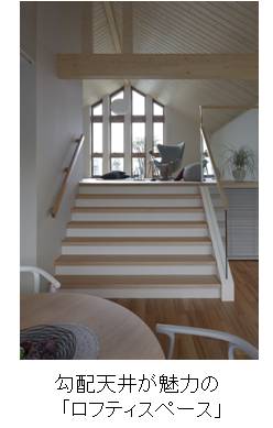 3.7m天井高のハイラウンジの上部空間は、 建物高さを上げることなく、 屋根勾配に沿った勾配天井とすることで余裕のある天井高を確保し、 光と風を取り込む魅力的な居室空間「ロフティスペース」を実現しました。