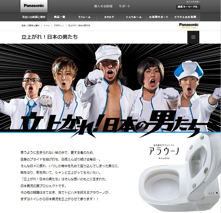 パナソニックでは、 今回の調査結果をふまえ、 思うままに立って用を足していただくべく、 世の男性を鼓舞する動画「立上がれ!日本の男たち」を作成。 この機会に、 特設サイトと合わせてスペシャル動画もぜひご覧ください。