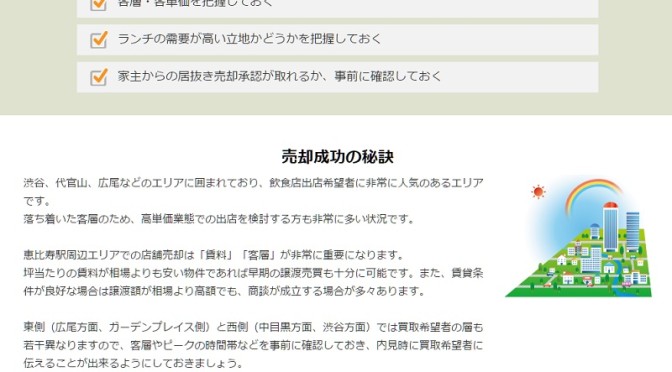 店舗を売却するために募集時に知っておくまたは整理しておく必要のあるポイントをまとめています。 客層・立地など駅、 エリアの特性に合わせたチェックポイントとなっています。