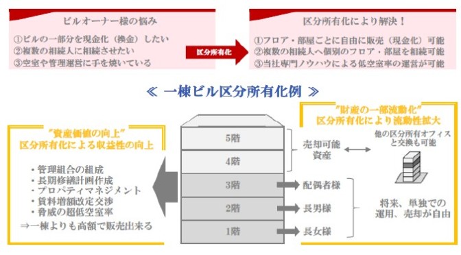 高額なビルを一棟丸ごと購入できる人は限られてしまいますが、 フロア単位・部屋単位であればサラリーマンなども購入対象者となり、 流動性が拡大します。