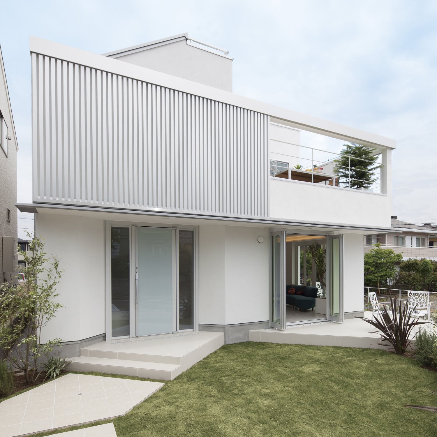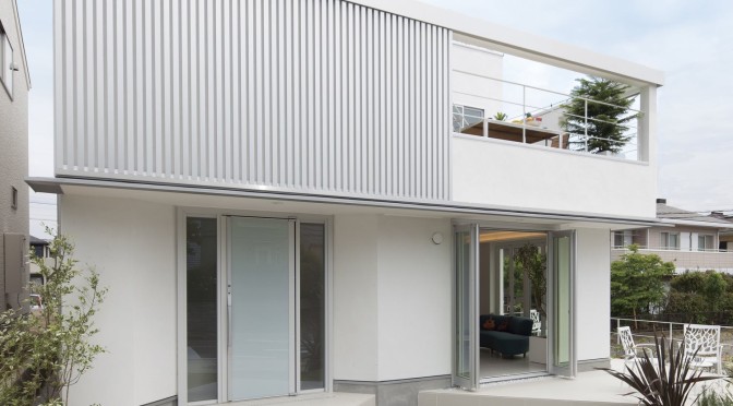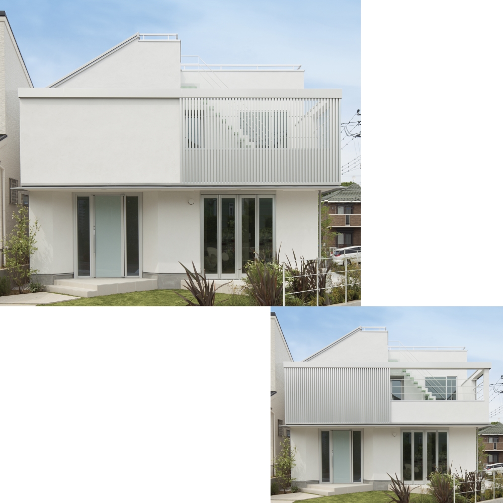住宅の外観要素の中でも配置がバラツキやすい開口部のバランスを、ルーバーでまとめることで、ファサードに緊張感が生まれデザインを引き締めます。さらにルーバーがスライドすることで、不変性の強いファサードに変化をもたらし、デザイン性を高めます。