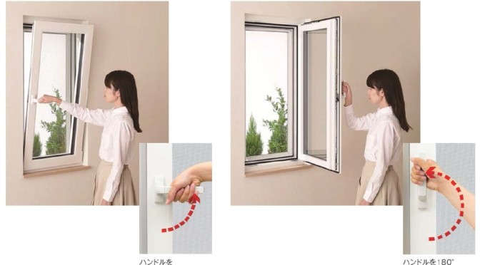 ハンドルを90°回転させることで室内側に倒すことができる「内倒し」と、 180°回転させることで室内側に開く「内開き」の2つの操作(ツーアクション)ができる窓です。