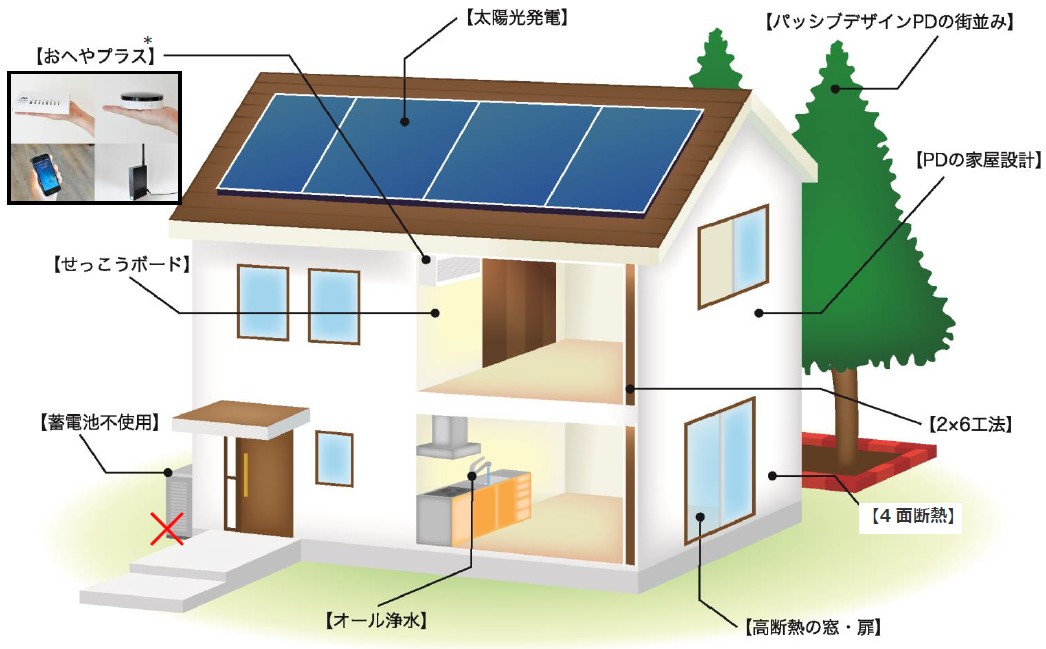 昨今、 各住宅メーカー等から蓄電池を加えた設備機器の充実によるエネルギー収支ゼロを目指す住宅の企画が相次ぎ発表されています。 それらの路線とは一線を画す取り組みとなります。 プロジェクトを構成している主な要素は以下の通りです。