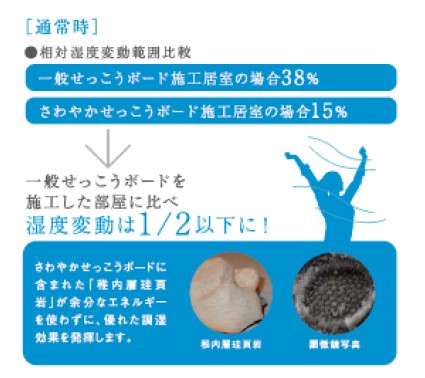 不快感につながりやすい湿度の上昇や下降を一般ボードの1/2以下に抑えるだけでなく、 せっこうボードに添加された天然特殊珪藻土が半永久的に湿気を吸ったり吐いたりすることで自然にダニ・カビの繁殖も抑えます。 快適湿度を保つことで夏場のエアコン設定温度を上げることができ、 光熱費削減を実現します。 ※詳細は後記のウェブサイトからご参照をお願い致します。