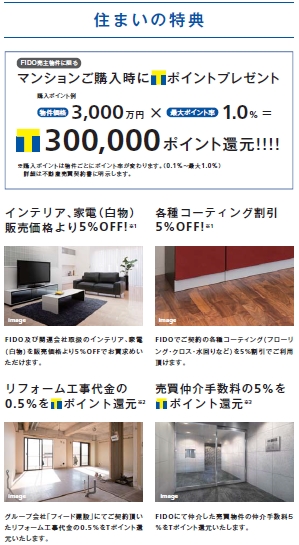 カード会員を対象として、 住まいと暮らしに関する様々な会員特典をご用意。 お電話一本で専門スタッフがお住まいの悩みに対応する「FIDOライフサービス」や、 インテリア・白物家電、 各種コーティング(フローリング・クロス・水回り)の割引サービス、 リフォーム代金・フィード仲介による不動産売買仲介手数料に対するTポイント付与などの特典をご利用いただけます。