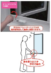 ハンドルを回すだけで開閉できるので大変軽い操作感です。 窓の前に障害物がある場合でも外に身を乗り出さずに開閉可能です。