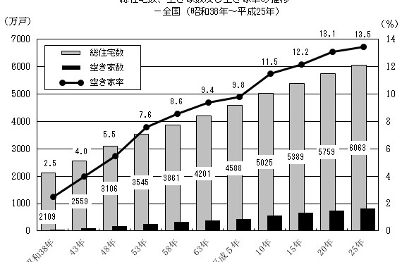 しかし、 これとは対照に、 人口の減少や少子高齢化の進展等により空き家が増加しており、 社会問題に発展しているのも事実です。 総務省発表の、 平成25年住宅・土地統計調査によると、 空き家数は平成20年に比べ63万戸(8.3%)増加し、 空き家率は13.5%と過去最高となりました。