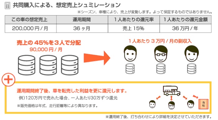 今回のシェアオーナー制では、 オーナー利用時以外は「CAMP IN CAR」((株)レヴォレーター)が他のお客様へのレンタル事業を行い、 シェアオーナーと収益をシェアすることになります。 3等分の場合、 15%の売上げシェアに加え、 年間平日に限り30日の無料利用(6万円相当)が付いてきます。 3年間の運用期間終了後は、 売却or継続の協議を行うこととなります。 自動車の管理・配車・整備等は全て「CAMP IN CAR」((株)レヴォレーター)が行いますので、 シェアオーナーは手間要らずでキャンピングカーのオーナーライフを実現し、 収益シェアを受けることが可能になります。