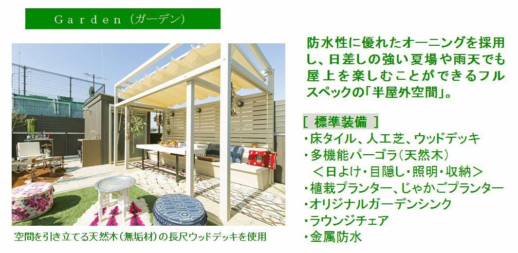 デザインプランはGarden(ガーデン)、 Terrace(テラス)、 Scape(スケープ)の3種類。 木造構造と親和性の高い「金属防水」の屋上全面施工のほか、 化粧を兼ねた「床タイル」、 また日よけ・目隠し・照明・収納空間を備えた天然木の「多機能パーゴラ」や「ポーチ」を標準装備しており、 菜園プランターやジェットバス、 オリジナル家具、 全天候型スピーカーなど個人のライフスタイルを多彩に演出するオプションも充実しているところが新プランの大きな特徴です。