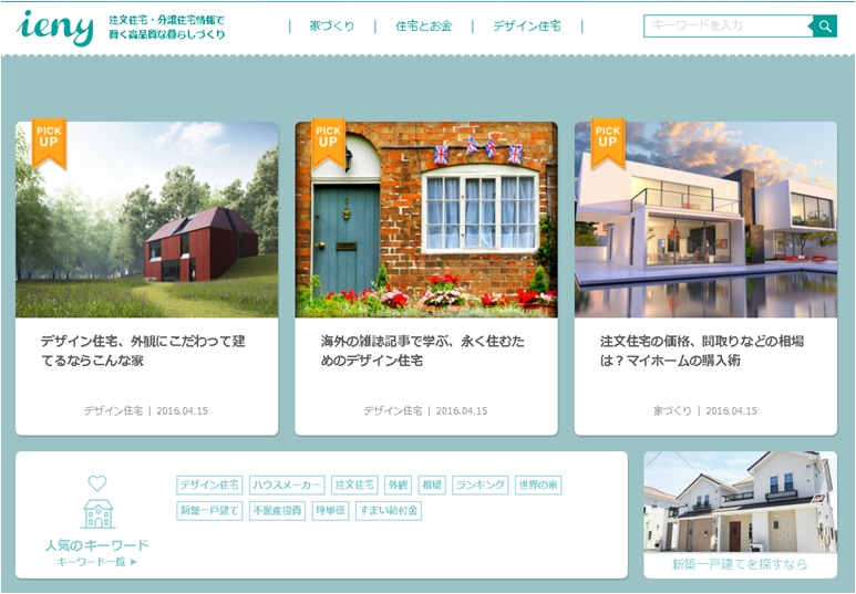 そこで、 高品質な、 賢い家づくりをリーズナブルに実現して頂くため、 暮らしや住宅に関する情報を提供するサイト 『ieny(イエニー)』 を立ち上げました。 まずは 「家づくり」「住宅とお金」「デザイン住宅」 の3カテゴリを中心に、 住宅の購入を検討している方々にお役立ていただける情報を発信していきます。