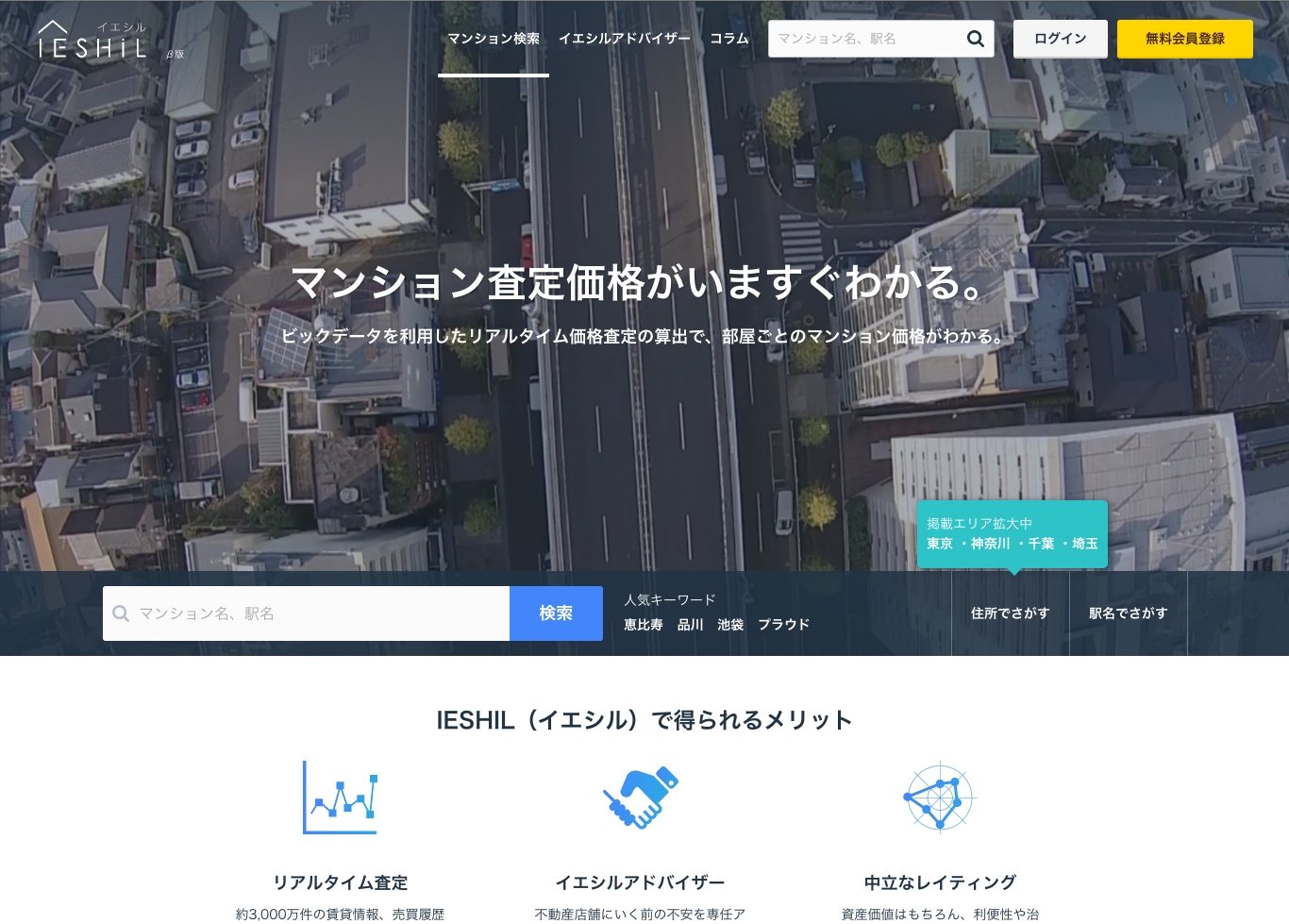 IESHILでは、 約3,000万件にのぼる売買・賃貸履歴などのビッグデータを活用した独自のリアルタイム査定(特許出願中)システムにより、 マンション物件の市場価格や価格推移、 推定賃料(※2)を公開しています。 また、 住生活に密着した旬のトピックスや住宅ローン、 税金など、 不動産売買に役立つ様々な情報を「イエシルコラム」にてご提供しています。 さらに、 2016年2月には、 ITを活用した情報提供に加え、 新たに不動産売買を検討中或いはこれから検討される方々(ユーザー)に、 専門アドバイザーが無料で不動産売買の基礎情報や売買のコツをお伝えしたり、 ニーズに合った不動産会社のご紹介や商談サポートをしたりする「イエシル・アドバイザー」サービスの提供を開始いたしました。