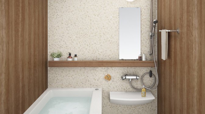 「Refoms(リフォムス)マンションリフォーム用」は、 戸建住宅用システムバスで好評のインテリア性や収納性にもこだわった「おきラク手すり」を標準搭載。 「おきラク手すり」により、 浴室内での一連の動作をサポートするとともに、 使いやすい位置に収納スペースを確保することが可能となりました。 また、 素早く浴室を暖め、 カビも抑制する「カビシャット暖房換気乾燥機」や「フラットラインLED照明」も搭載が可能。 おそうじ性にも配慮した使いやすいお風呂にグレードアップすることも可能です。 さらに、 戸建住宅用のリフォムスで好評の壁柄を共用でラインアップし、 正面や側面のアクセントパネルは16柄70種の多彩な壁柄バリエーションで、 お好みのバスルームを実現することができます。