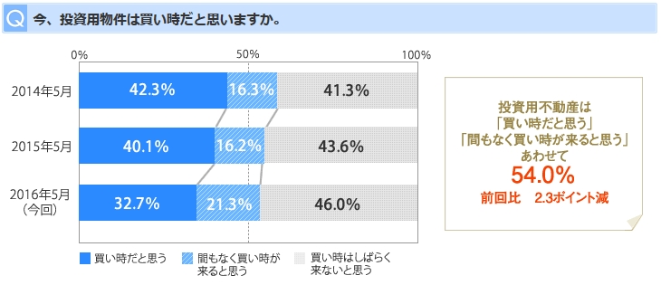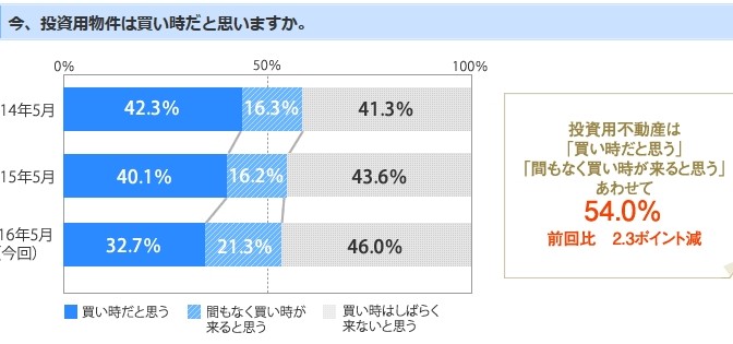・投資用物件の買い時感については、 「買い時だと思う」「間もなく買い時が来ると思う」を合わせると54.0%で、 前回調査(2015年5月)より2.3ポイント減少し、 買い時感は下がったという結果となった。 しかしながら、 「間もなく買い時が来ると思う」の回答だけをみると、 前回調査より5.1ポイント増加していることから、 回答者の心理の変化がうかがえる。