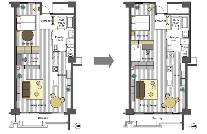 たとえば、 数年間は夫婦2人でリビング・ダイニングを広く使い、 子供が生まれ家族が増えると、 家具を移動させ、 子供の遊び場や育児スペースを確保。 そして子供の成長に合わせ、 家具や間仕切りを足し、 集中して勉強できる部屋をつくることも可能。 いずれ子供が大きくなり家を出たら、 また夫婦でゆったりと過ごせる住まいへと変更できます。