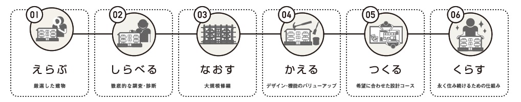 「くらし、 生活をリノベーションする」をコンセプトに、 既存建物の改修・再生を手がける会社として設立。 「次の不動産の常識をつくり続ける」を経営ビジョンに掲げ、 一棟、 一戸単位のマンションや戸建てのリノベーション分譲事業やリノベーションコンサルティング事業、 シェア型賃貸住宅や商業施設、 公共施設の企画・運営、 PM・サブリース事業、 ホテル事業を手がけています。