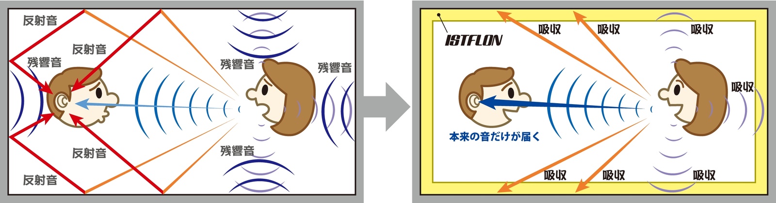 室内で反射する音(反響、 残響)を吸収し、 人の声や音を聞き取りやすく改善することができます。
